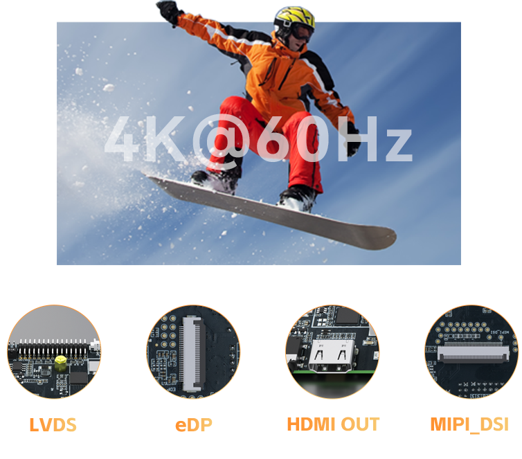 | 显示接口 | LVDS:1920*1080@60Hz eDP:2560*1600@60Hz HDMI OUT:3840*2160@60Hz MIPI_DSI:1920*1080@60Hz |